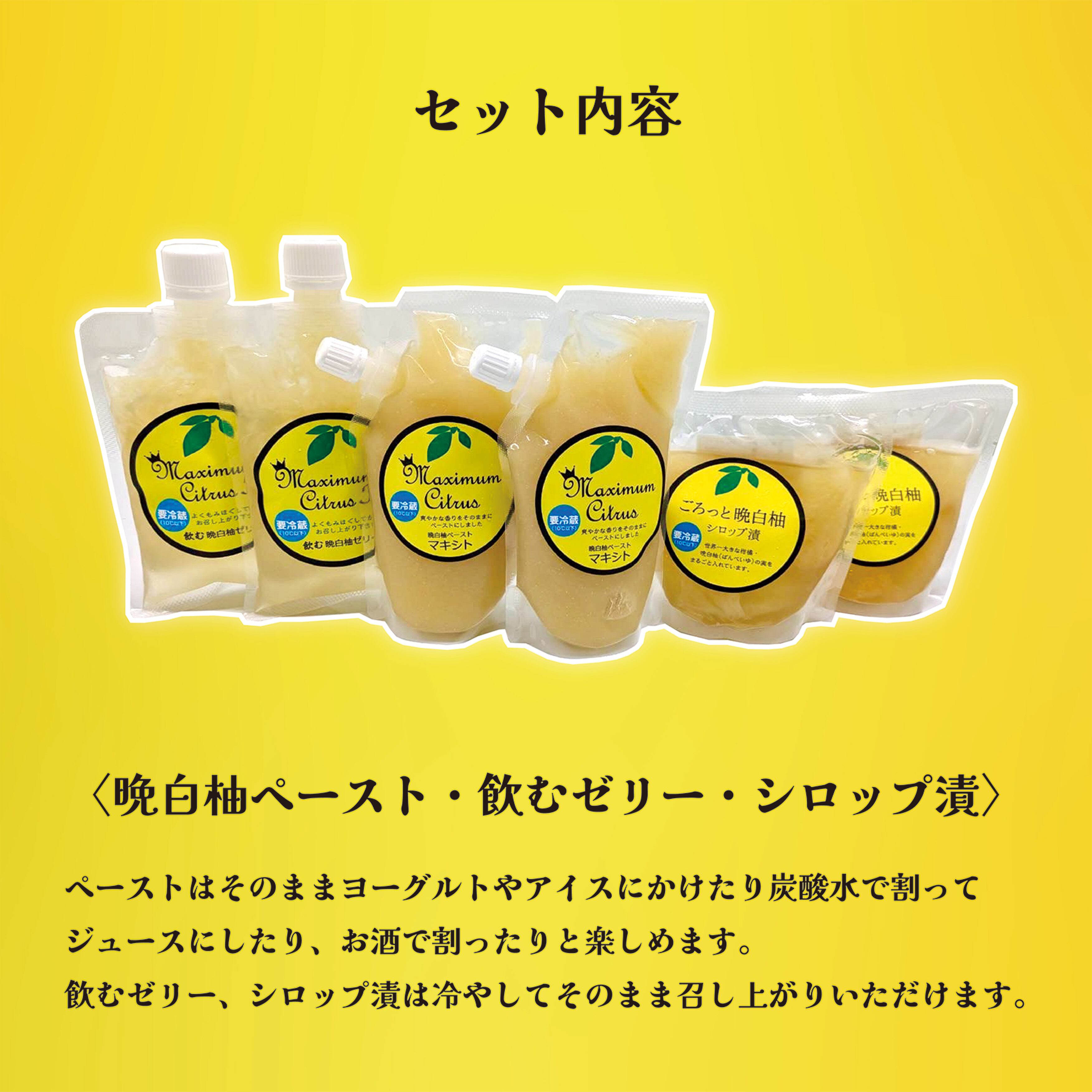 晩白柚ペースト「マキシト」250g×2・晩白柚シロップ漬け「ごろっと晩白柚」200g×2・晩白柚飲むゼリー「マキシトゼリー」180g×2
